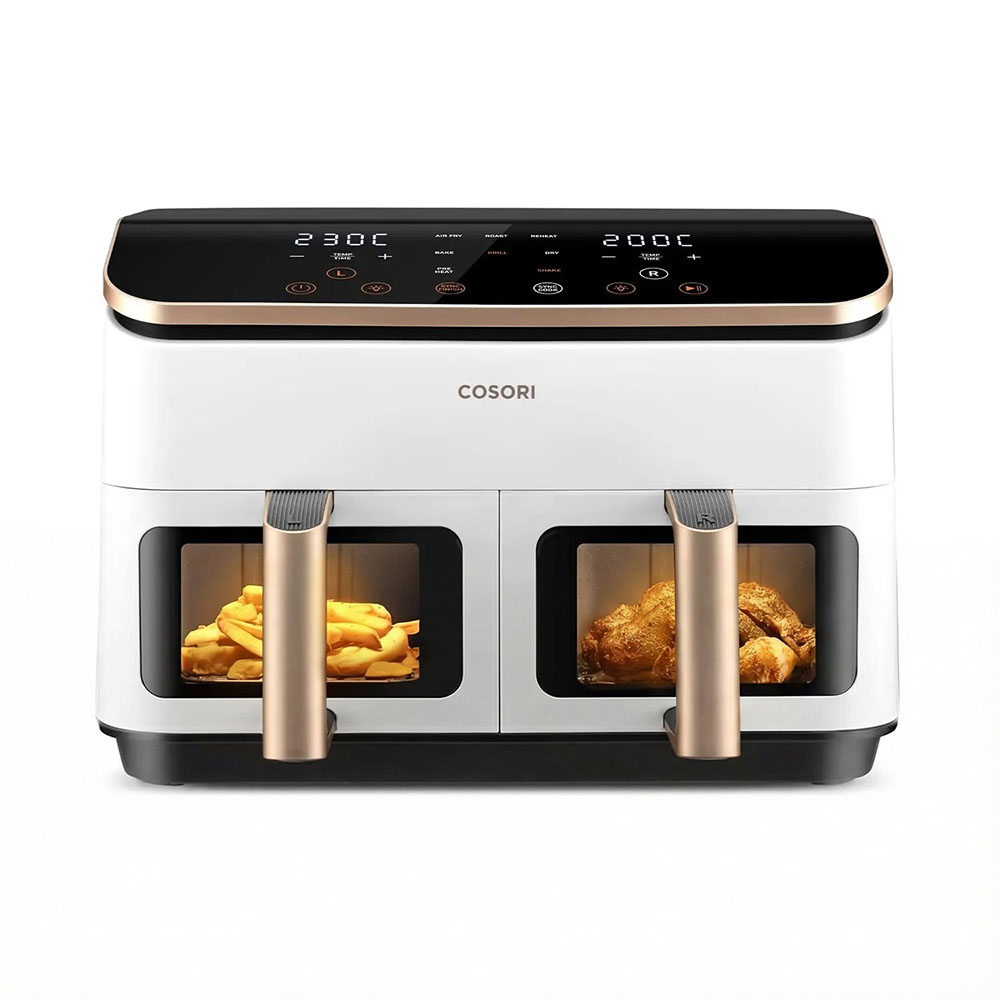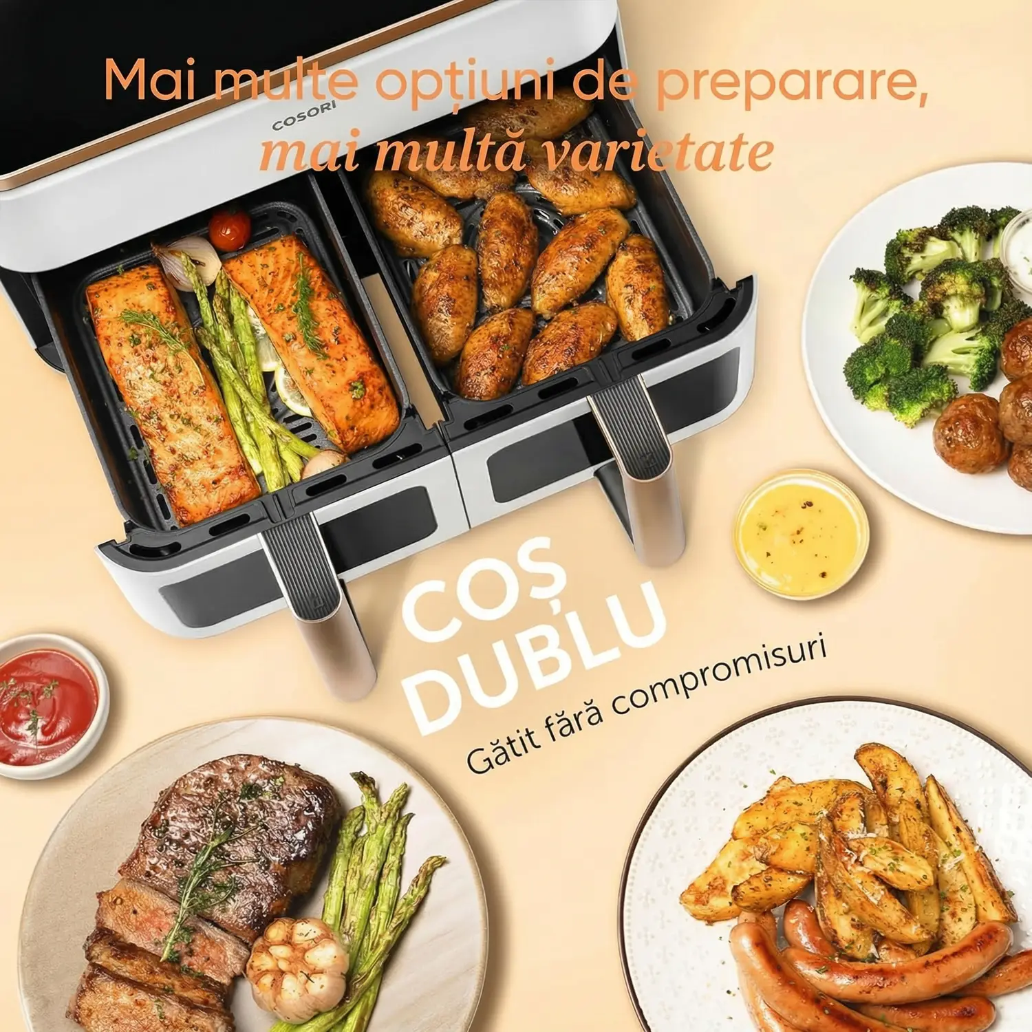 Friteuză cu aer cald, Cosori CAF-R904-AEU, 2 compartimente, 6-in-1, zona dublă, XXL, 8.5 L, fereastră de vizualizare,1750 W, Alb/Auriu