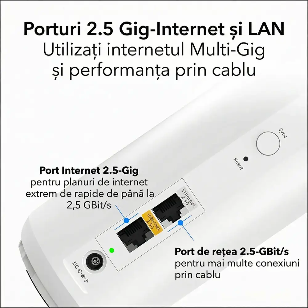 - Port Internet 2.5GbE pentru abonamente rapide prin cablu sau fibră.