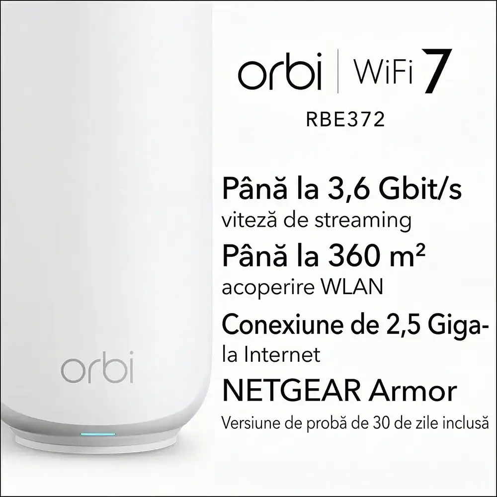 NETGEAR Orbi Seria 370 (RBE372) este un sistem Mesh WiFi 7 cu 1 router + 1 satelit, ideal pentru acoperire stabilă în locuință. Oferă viteze de până la 3.6 Gbps (BE3600), acoperire de până la 240 m², suport pentru până la 70 de dispozitive și port Internet 2.5GbE.
